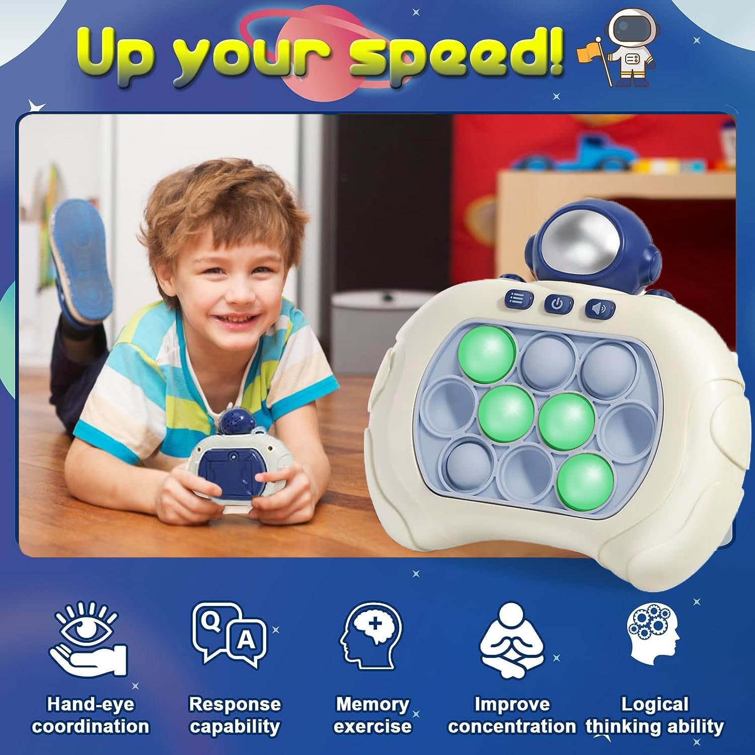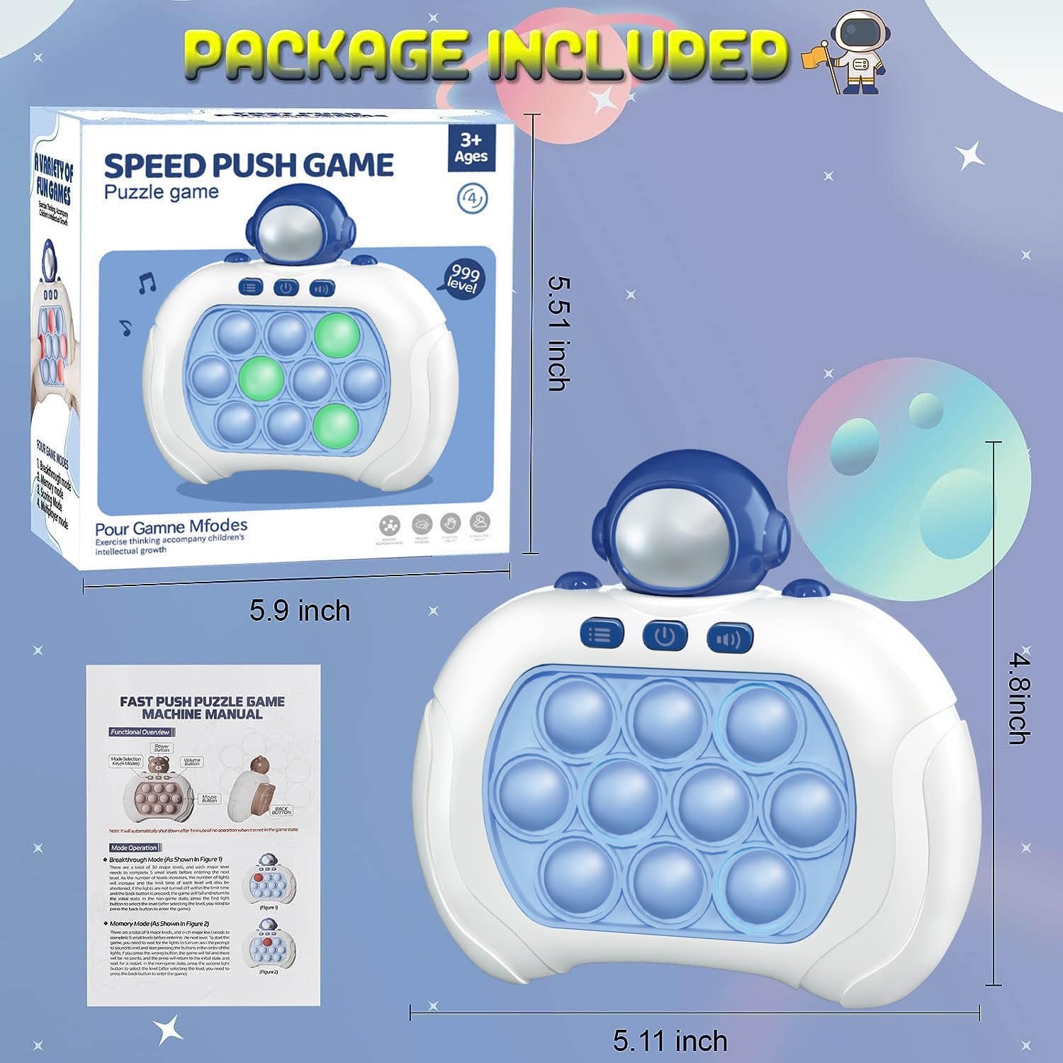 - Pop It Fidget Toy – Pop it game of addictive classic bubbles combined with a fast and fun mole game, perfect for parties, on-the-go games, parent-child interactions to train their reflexes and keep them away from their phones. Just insert three AAA batteries (not included), adjust the volume to your liking, and start playing for endless fun.