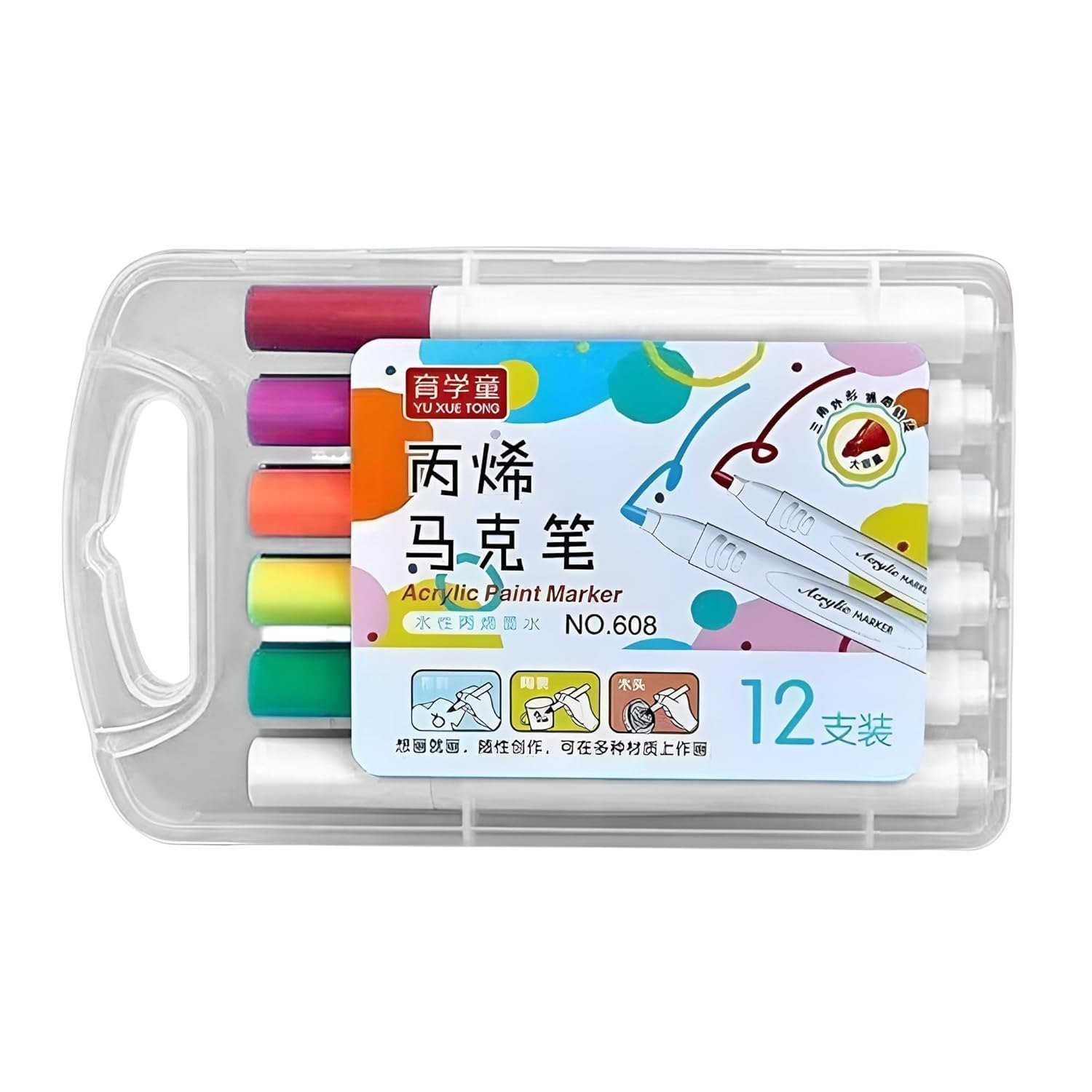 - Complete Set: 12 vibrant acrylic paint markers in assorted colours including white, yellow, green, blue, pink, and red, perfect for various art and craft projects